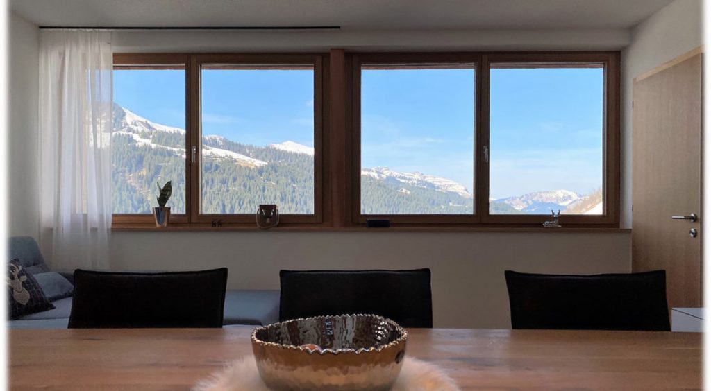 Das Apartment 2 im Berg Aparts Faschina ist sehr liebevoll und mit viel Vollholzmöbeln auch sehr hochwertig eingerichtet. Der Wohn- und Essbereich bietet mit seinem großen Esstisch, dem geräumigen Sofa und dem schönen Panoramablick viel Platz zum abschalten und entspannen. Das Sofa bietet auf Anfrage auch Platz für eine weitere Person als Schlafstätte.