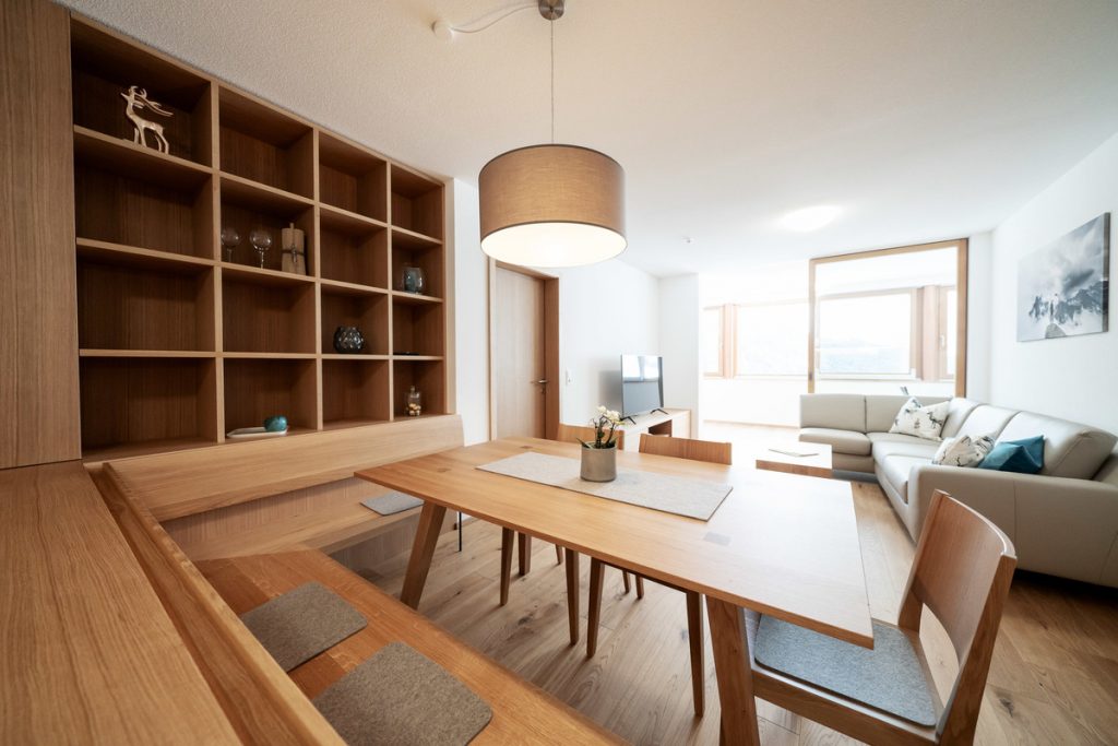 Unsere Wohnung ist mit heimischen Vollholzmöbeln sehr gemütlich eingerichtet. Das große Wohnzimmer mit TV und Couch bietet Platz für die ganze Familie.